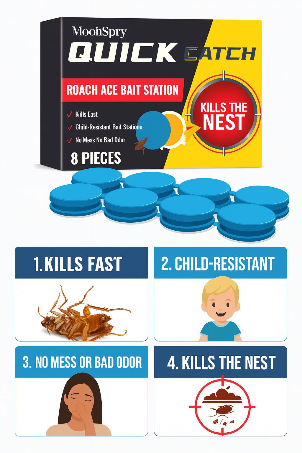 Eliminate roaches quickly and safely with the QuickCatch Roach Bait Station. Designed with a child-resistant casing and a powerful attract-and-kill formula, this 8-pack bait system targets roaches at the source — destroying nests and stopping infestations fast. No mess, no odor, just clean and effective pest control.